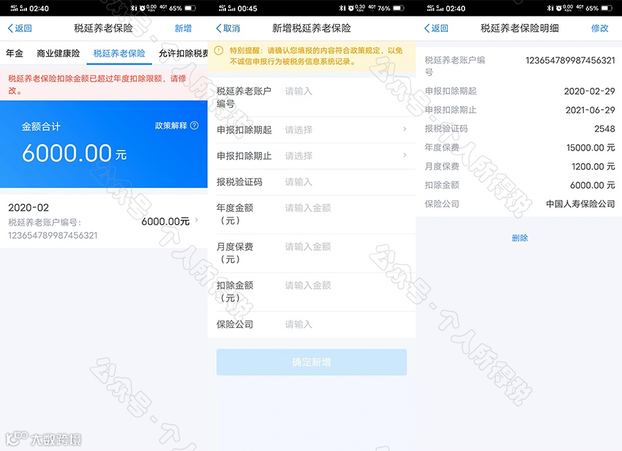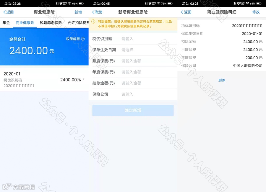 在其他扣除明细列表界面,您可点击【商业健康险】、【税收递延养老保险】页面,分别进行新增和修改。