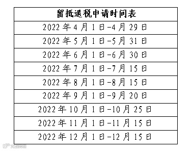 纳税人应在纳税申报期内,完成当期增值税纳税申报后申请留抵退税。2022年4月至6月的留抵退税申请时间,延长至每月最后一个工作日。纳税人可以在规定期限内同时申请增量留抵退税和存量留抵退税。2022年留抵退税具体申请时间安排如下:
