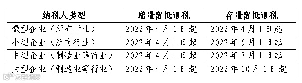 根据党中央、国务院关于加大增值税期末留抵退税(以下简称留抵退税)力度的决策部署,从2022年4月1日起,进一步加大留抵退税实施力度,将先进制造业按月全额退还增值税增量留抵税额政策范围扩大至符合条件的小微企业、制造业等行业企业(含个体工商户,下同),并一次性退还上述企业存量留抵税额。