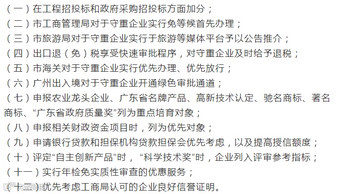 | 15 | 广东省工商行政管理局 | 1、 为“守合同重信用”公示企业提供窗口绿色通道服务;鼓励和支持发展连锁经营和分支机构,对“守合同重信用”公示企业设立分支机构,实行优先办理,政策倾斜; |