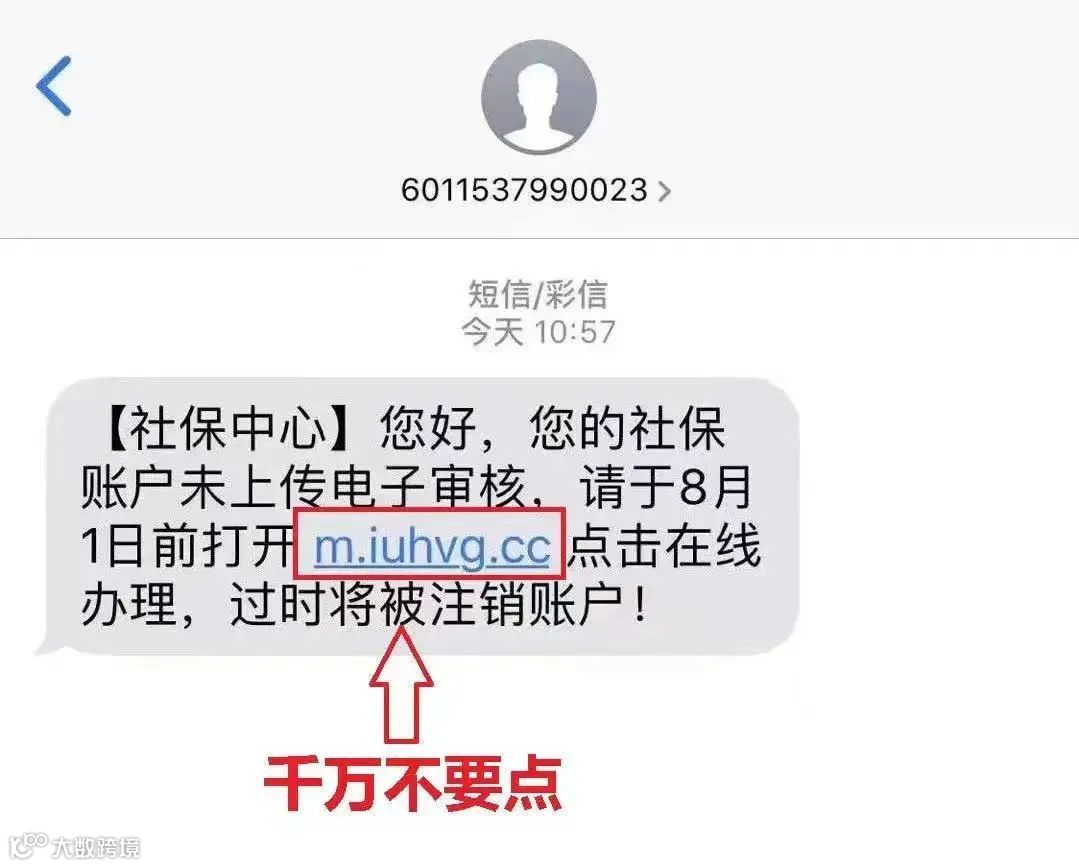 或者自称“社保中心”,通知参保人“您的社保账户未上传电子审核,请于XX月XX日前打开xxxxxxx点击在线办理,过时将被注销账户”。