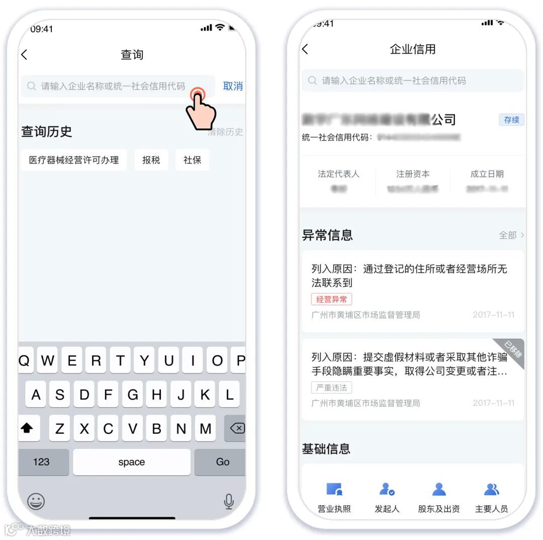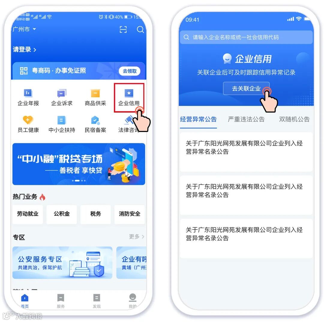 打开“粤商通”APP,进入“企业信用”页面,点击“去关联企业”并按提示关联企业,完成后即可及时跟踪信用异常记录。