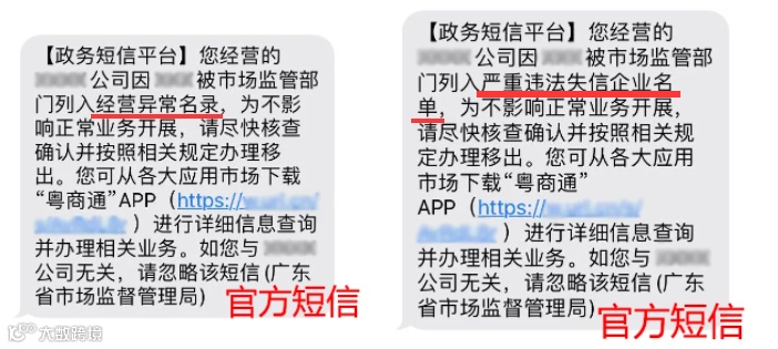 “被列入经营异常名录”的短信通知