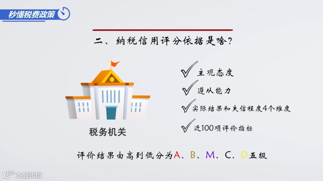 税务部门依据主观态度、遵从能力、实际结果和失信程度4个维度、近100项评价指标,对企业纳税人信用状况进行评价。评价结果由高到低分为A、B、M、C、D五级: