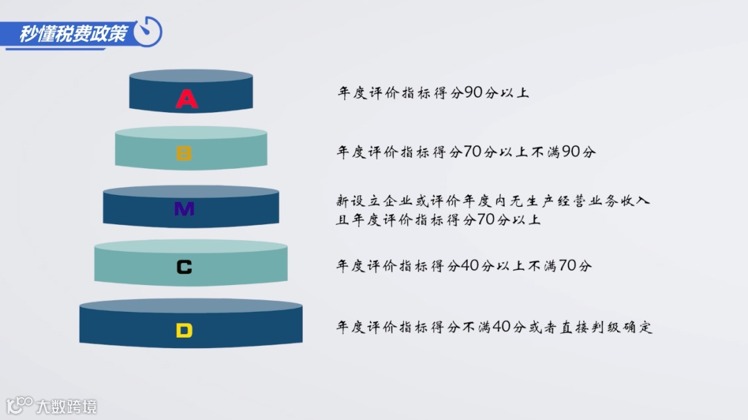 A级∶年度评价指标得分90分以上;B级∶年度评价指标得分70分以上不满90分;M级∶新设立企业或评价年度内无生产经营业务收入且年度评价指标得分70分以上;C级∶年度评价指标得分40分以上不满70分;D级∶年度评价指标得分不满 40分或者直接判级确定。