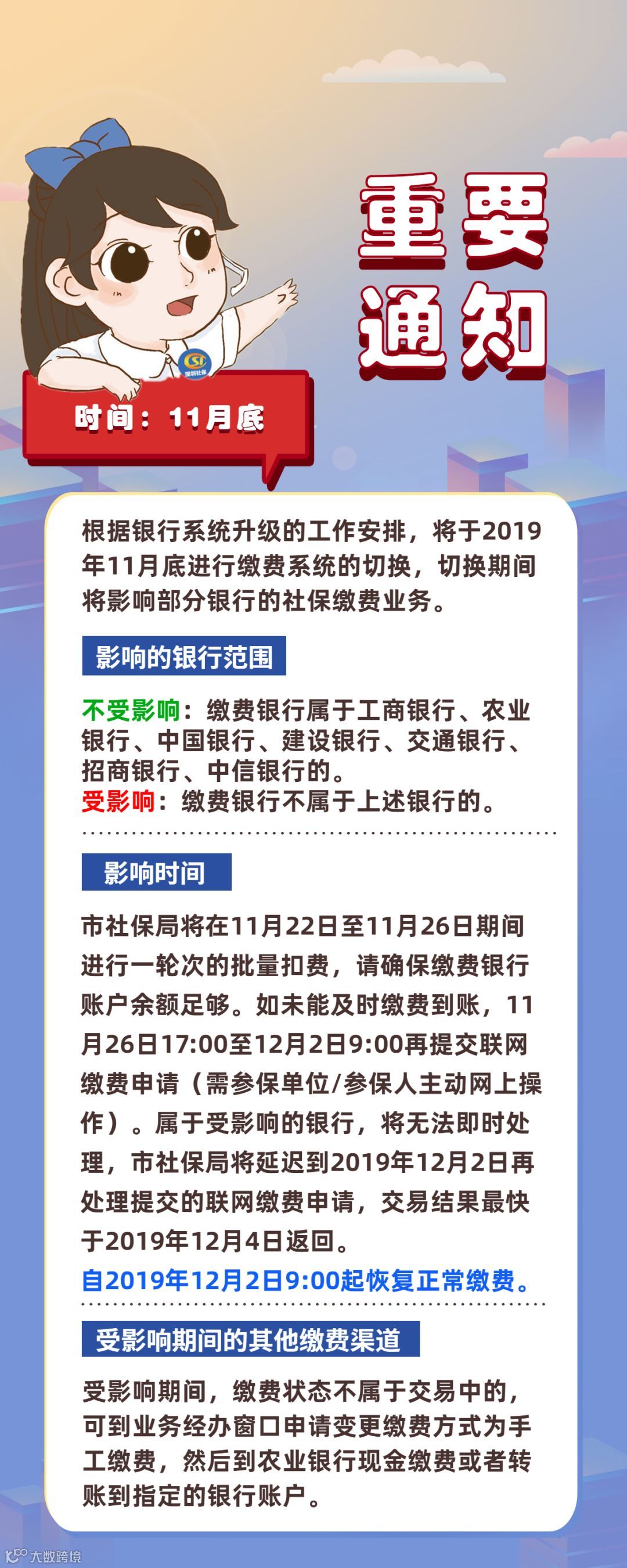 本月缴社保费银行属于工商银行、农业银行、中国银行、建设银行、交通银行、招商银行、中信银行的不受影响,其他扣费的银行请登录操作补扣,延期至12月2日。