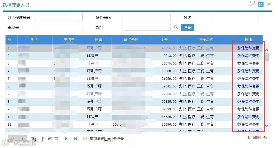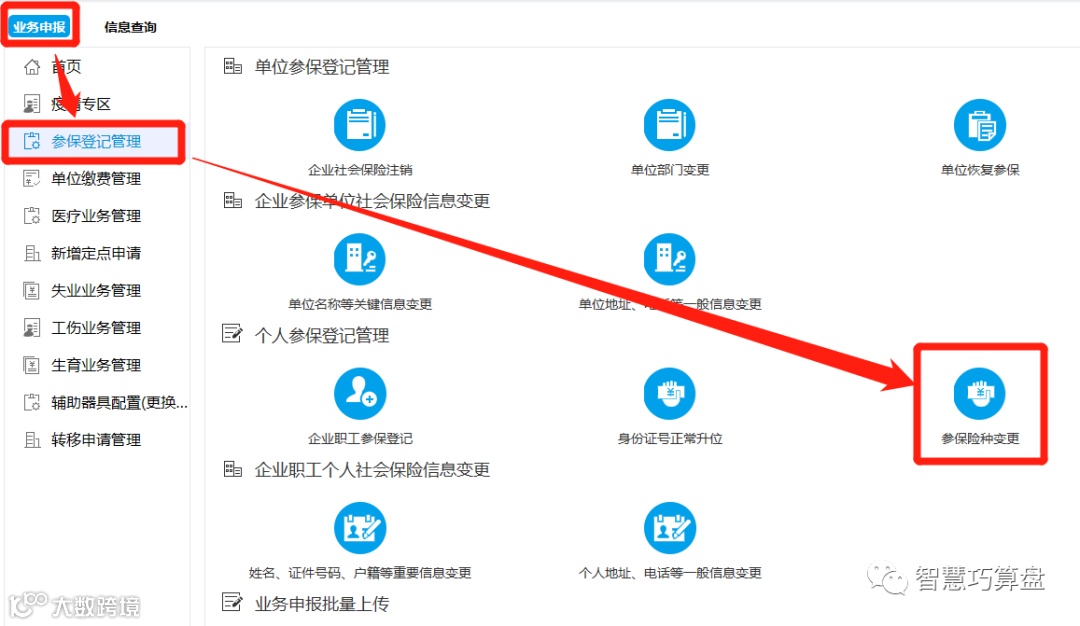 选择→变更人员→参保险种变更。(温馨提示:参保险种变更无法批量操作,需逐一选择变更人员)
