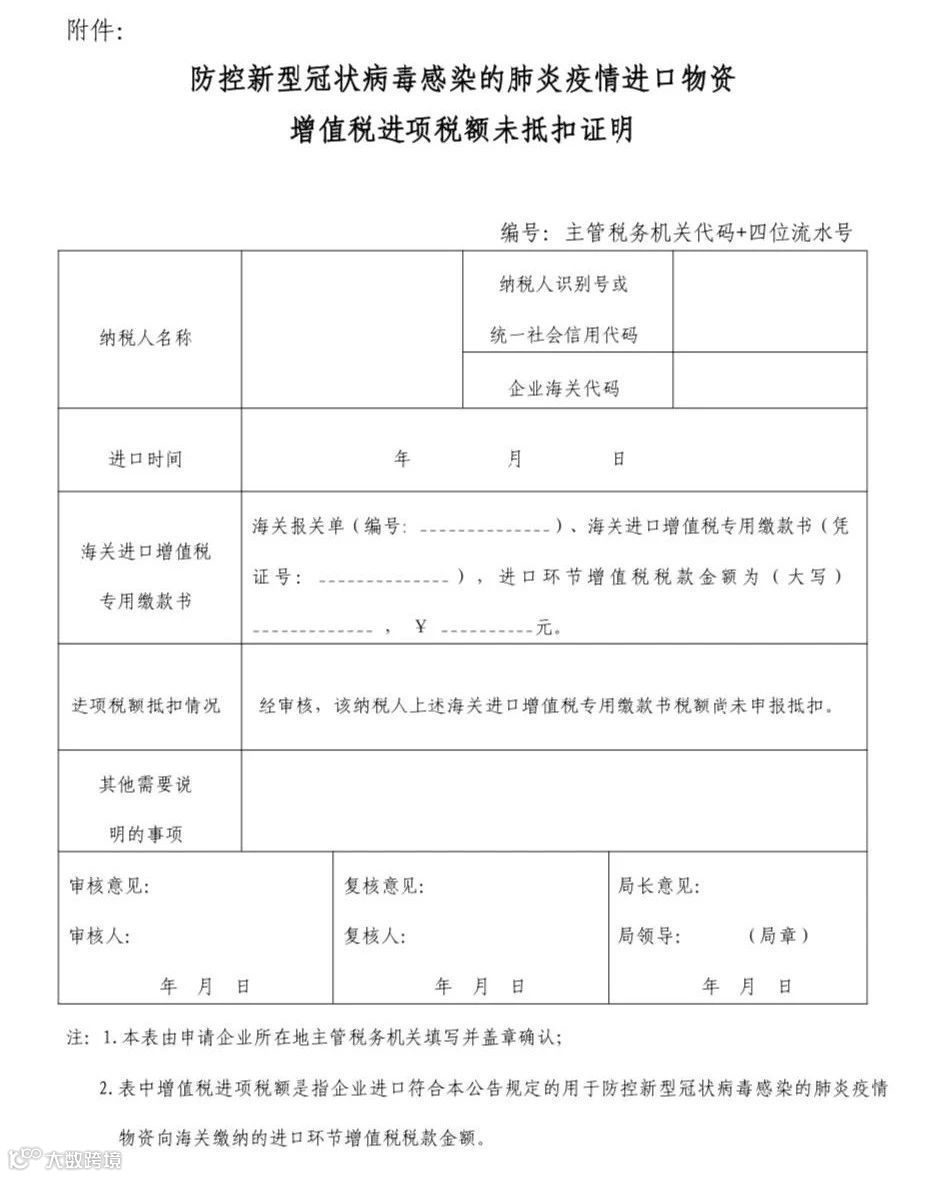 附件:防控新型冠状病毒感染的肺炎疫情进口物资增值税进项税额未抵扣证明