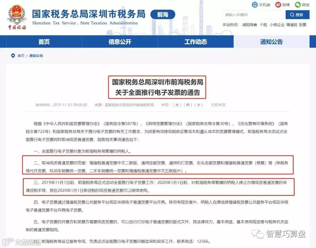 2019年11月1日,深圳市前海税务局发布《关于全面推行电子发票的通告》。2020年1月1日起,停止办理纸质普通发票的申请领购手续。
