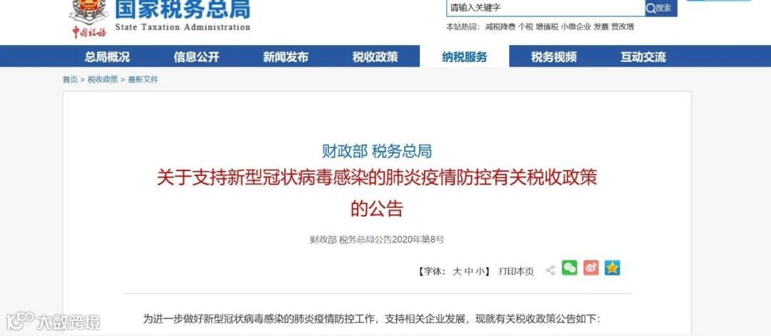 为减轻疫灾对纳税人带来的损失,财政部联合国家税务总局出台临时性税收政策《关于支持新型冠状病毒感染的肺炎疫情防控有关税收政策的公告》(财政部 税务总局公告2020年第8号)
