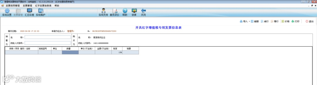 3.进入红字发票信息表填开界面,输入要红冲的蓝字发票信息,核实无误点击右上方“打印”按钮(如果选择销售方申请,信息表内容自动带出);