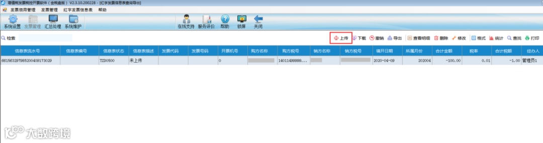 5.选择列表待上传红字发票信息表,点击上方“上传”按钮,审核通过之后,系统返回16位信息表编号。