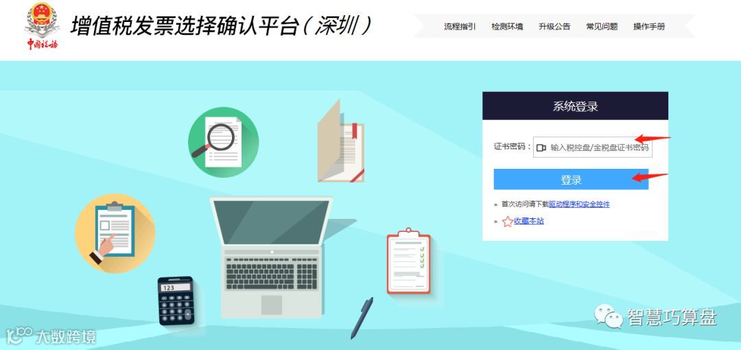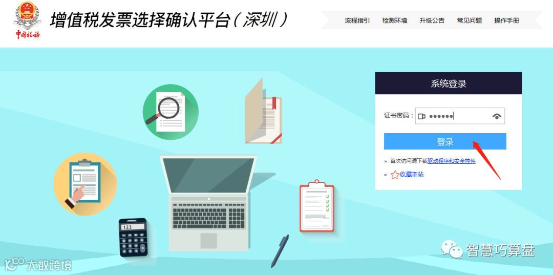 控件安装完成后,返回勾选平台,在框内输入税控盘密码,点击登录。(非首次访问的纳税人可跳过第二步)
