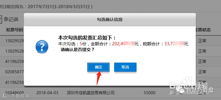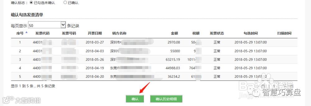 8、这时候会跳出刚才勾选的发票,然后点击下方的“确认”
