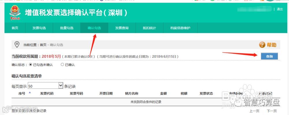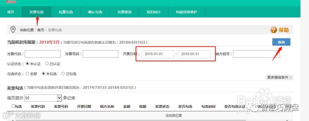 2、进到发票勾选的界面,选好供应商的开票日期,这个范围可以选择大一点,然后点击查询