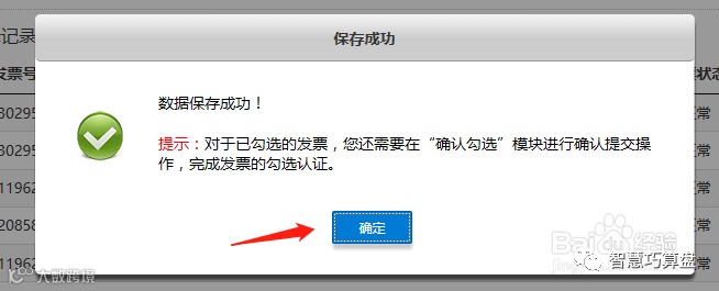 11、在跳出来的发票勾选成功的界面,继续点击”确定“