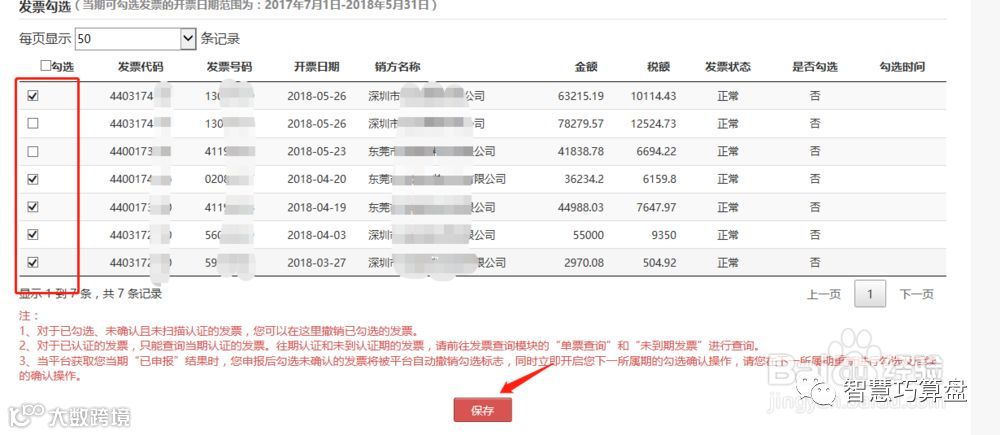 4、然后勾选出需要认证发发票,勾选好后点击下方的保存