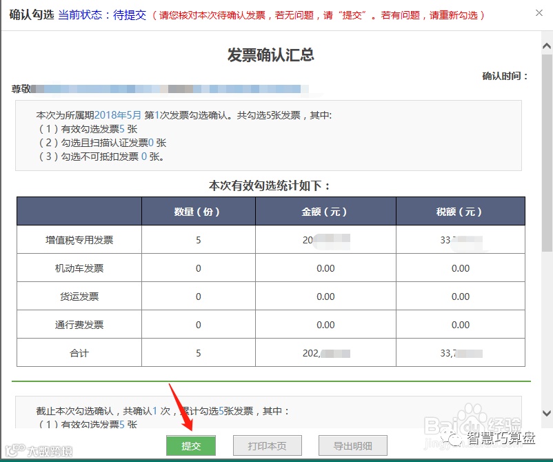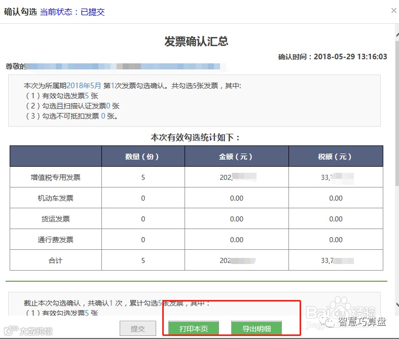 12、这样发票就算是认证了,我们可以导出认证明细,也可以把他打印出来