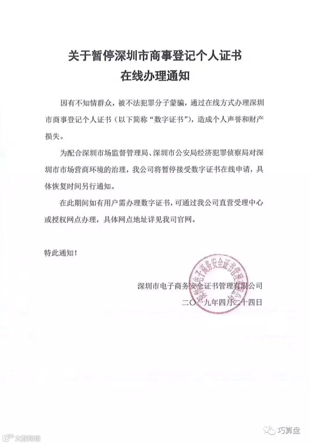 接到关于暂停深圳市商事登记个人证书在线办理通知,深圳CA系统升级2019年4月26日下午6点后系统进行升级,系统升级完成时间另行通知,异地的客户请抓紧办理!数字证书升级期间,需要注册、变更的网上全流程业务只能专程来深在银行办理UKEY了。