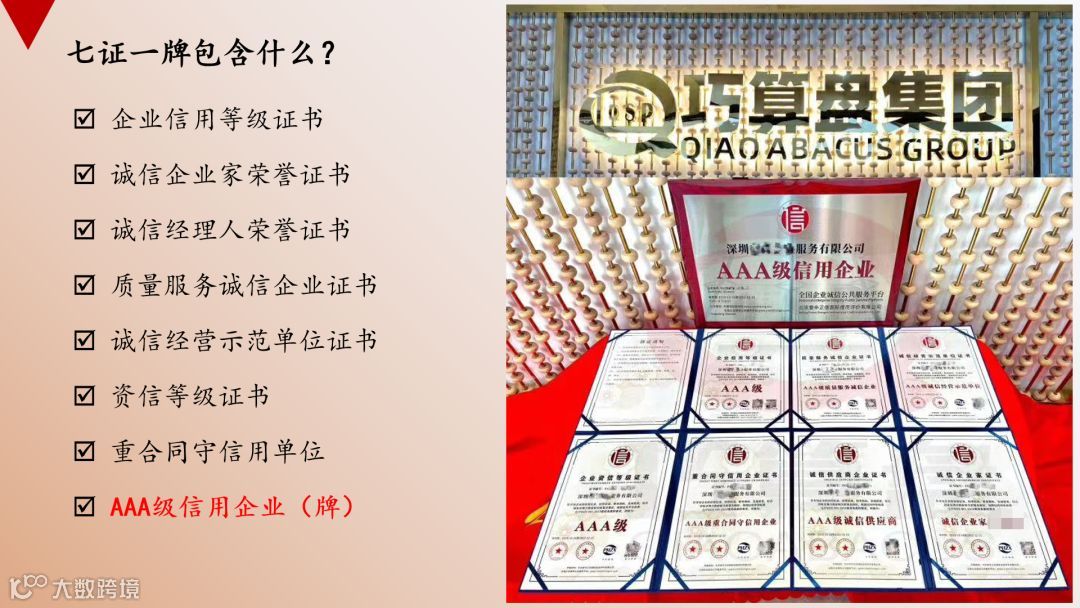 7个证书加一个铜牌【简称“七证一牌”】。