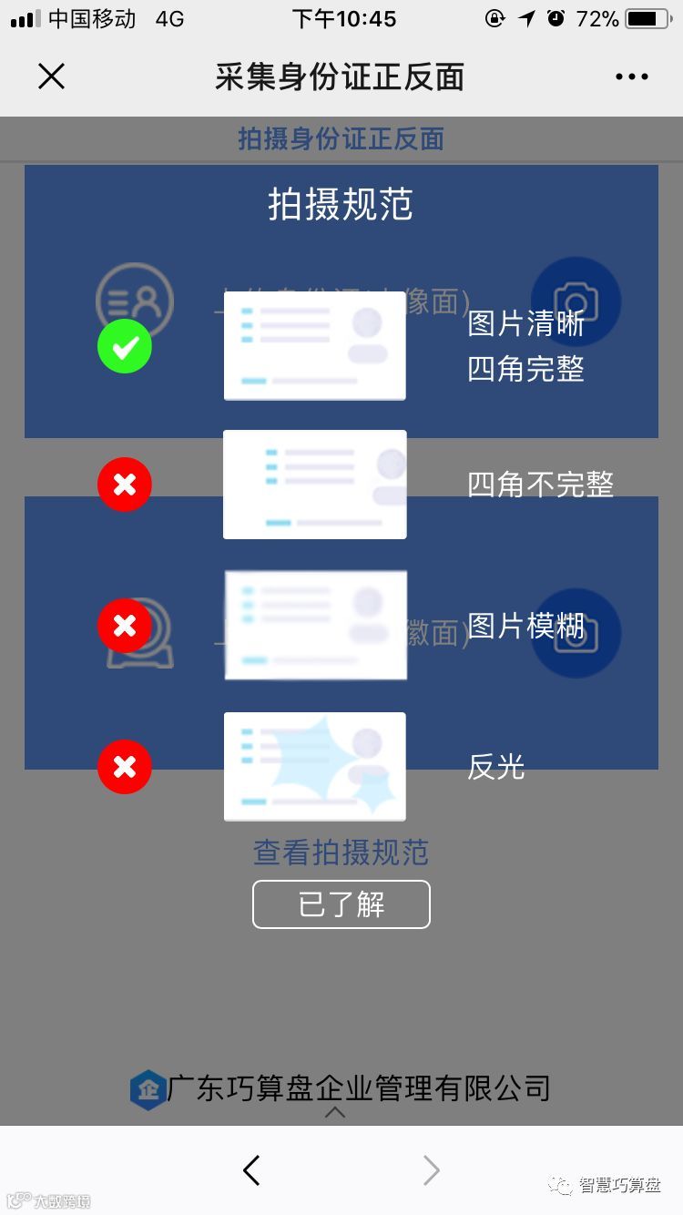 步骤四:采集身份证正反面照片,要求图片清晰,四角完整;图片模糊、不完整、反光统统都得不行!!!上传完成后会直接跳转到下一步