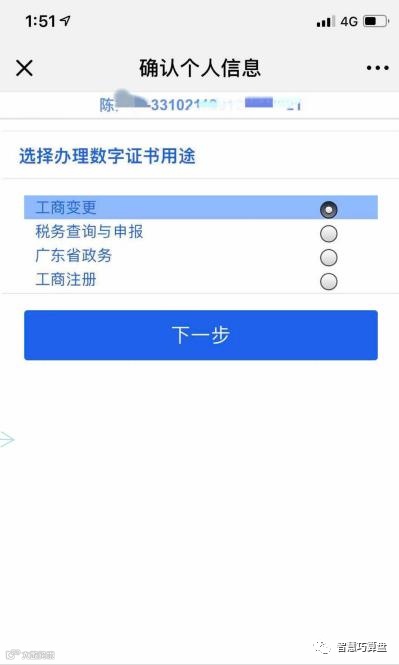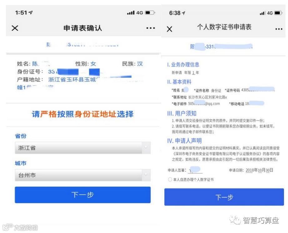 步骤八:申请表确认,需严格按照身份证地址选择身份及城市,确认无误后点击下一步,勾选‘我自愿办理个人数字证书’,点击进入下一步