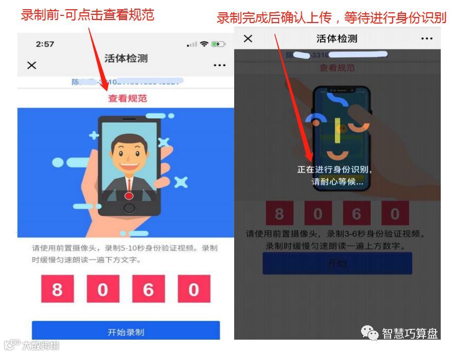 步骤九:录制3-10秒的身份验证视频,录制时缓慢匀速朗读屏幕出现的数字,等待识别验证成功后进入下一步