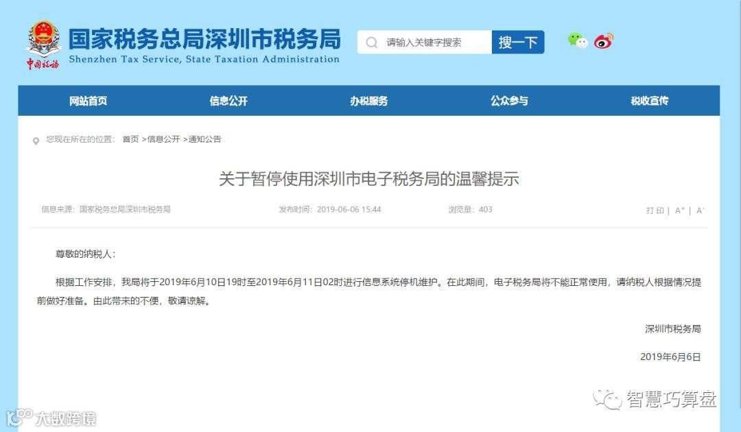 根据工作安排,我局将于2019年6月10日19时至2019年6月11日02时进行信息系统停机维护。在此期间,电子税务局将不能正常使用,请纳税人根据情况提前做好准备。由此带来的不便,敬请谅解。