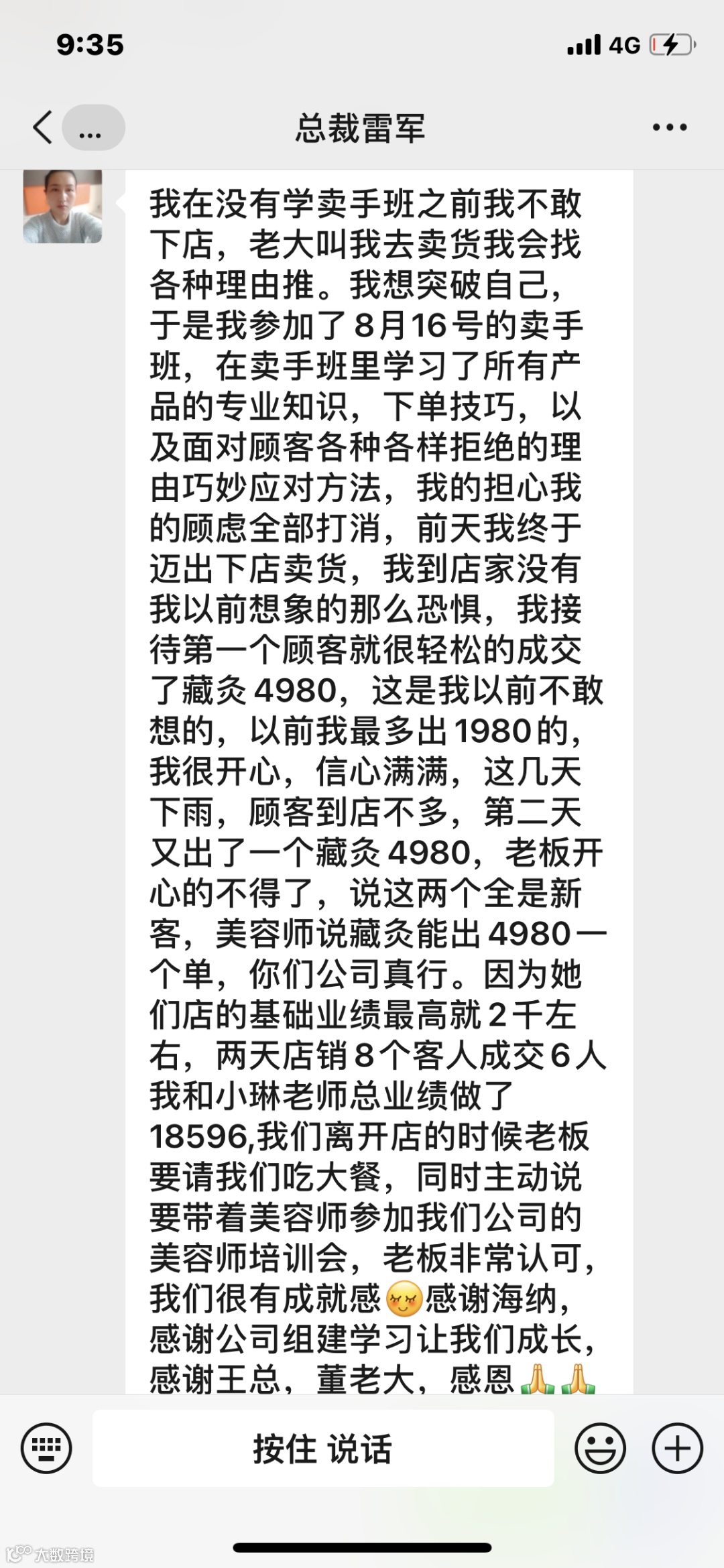 董佳林董总带队,围绕“卖货、售后”环节,以“培训-演练-实操-考试”为一体进行培训。通过卖货分享会选出最好的3种方式进行练习,3天整理出1套完善的实战卖货技能。帮助新人掌握售后流程,高效提高与老板娘的沟通技能;帮助老人真正吃透产品专业,真正打通任督二脉。
