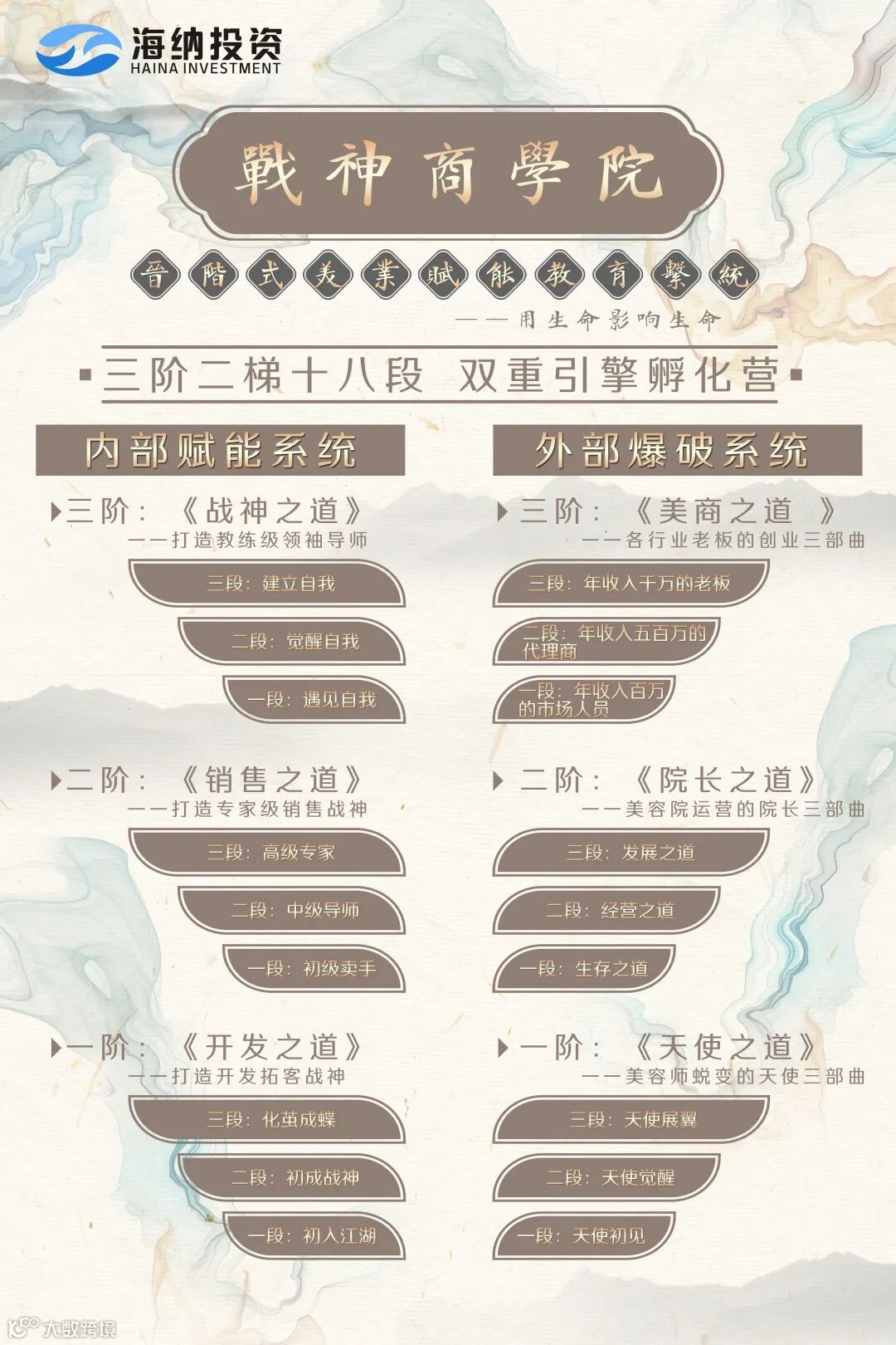 海纳《战神商学院》9月1日全面启航,秉承“传正念,帮正知,带正能”的宗旨,倾力打造“三阶二梯”晋阶式美业赋能教育系统,由王凯担任院长,汪雪琴担任执行院长,肖婷担任副执行院长,带领海纳平台旗下数百位金牌讲师,为全国近十万家美容院门店赋能。