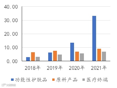 华熙生物凭借在玻尿酸原料领域的技术优势、价格优势,向下游重点拓展保湿、补水类型的功能性护肤品,加之营销费用投入较大,近三年,华熙生物的功能性护肤品的收入均保持在100%+/年,已经逐步向贝泰妮趋近。