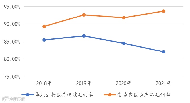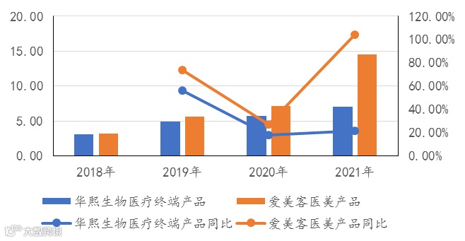 进一步对标爱美客,我们认为在医美类产品领域,华熙生物已被爱美客“甩开”,且这种差距在2021年被大幅拉开。