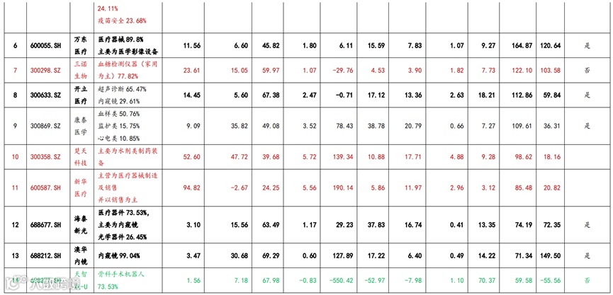 注:①上表中字体加粗的公司代表行业研究部分指出的重点关注公司;标红的公司代表主营不隶属医用医疗设备或被“ST/*ST”;标绿的公司代表本报告行业研究部分未覆盖到的医用医疗设备细分领域;