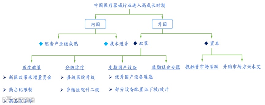 考虑中国医用医疗设备的空间、增速及政策敏感性等特点。同时,参考兴业证券绘制的中国医疗器械投资逻辑导图,本报告认为中国医用医疗设备的投资主逻辑为国产替代。