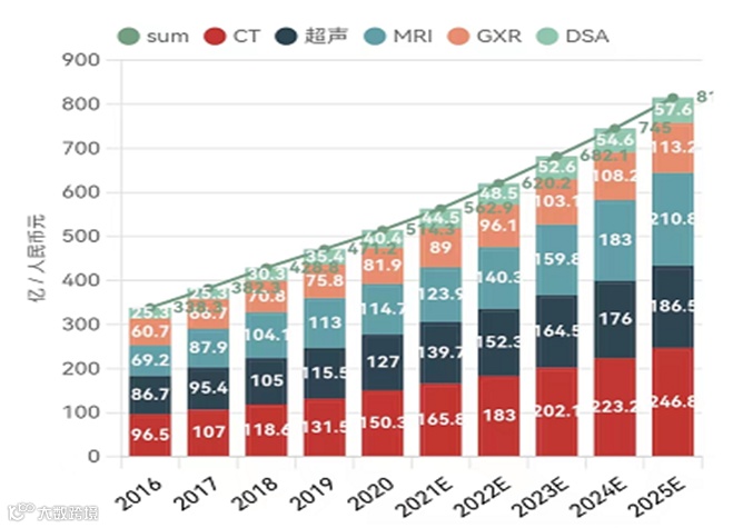 影像设备是医疗设备领域最大的细分市场。涵盖DSA、GXR、MRI、超声及CT细分市场,2016-2020年,中国主要医学影像设备行业市场规模由338.3亿元增长至514.3亿元,五年复合增长率为11.0%。2021E-2025E,未来五年,第三方医学影像中心发展、医学影像技术进步及叠加国产化进程加速,将成为驱动行业市场规模扩张的主要原因。基于此,主要医学影像设备行业市场规模将以9.7%的年复合增长率持续增长,到2025年,市场规模有望上升至815亿元。