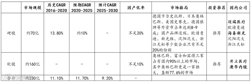 尚不考虑估值,主要从市场规模、预期增速、国产化率、市场格局等角度对内窥镜领域的投资机会进行判断,具体如下: