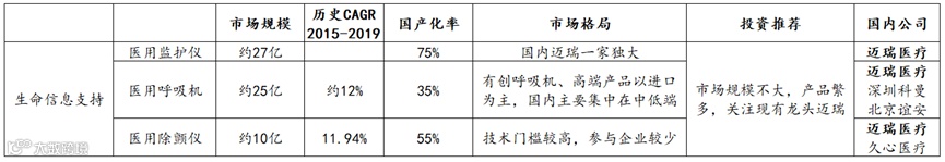 生命信息支持领域,各细分赛道市场规模不大,加之产品品类丰富,单一产品销售额难以成规模,现有龙头迈瑞医疗行业地位稳固,重点关注迈瑞医疗。