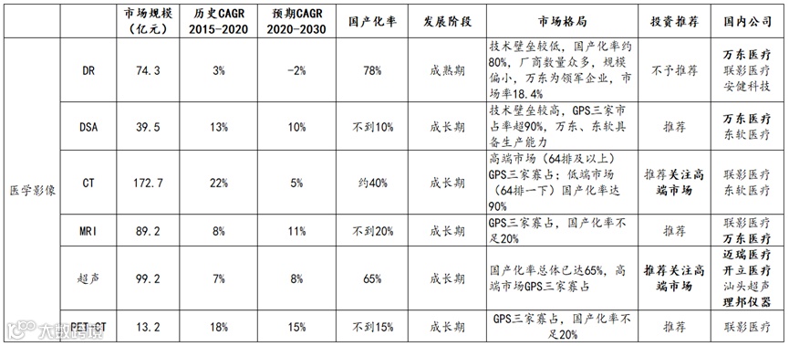 尚不考虑估值,主要从市场规模、预期增速、国产化率、发展阶段、市场格局等角度对影像诊断领域的投资机会进行判断,具体如下: