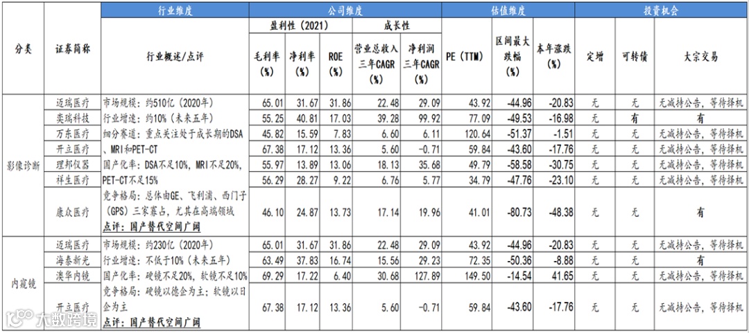 通过行业研究,本报告认为影像诊断、内窥镜、生命信息支持三大细分领域,影像诊断和内窥镜领域的投资机会优于生命信息支持领域。生命信息支持领域,产品繁杂,各系列产品销售规模均不大,具备丰富产品线及销售网络的公司将强者恒强,同时,受新冠疫情扰动,监护仪、呼吸机等生命信息支持设备业绩大幅波动,因此在该细分领域本报告仅关注龙头迈瑞医疗。进一步聚焦影像诊断和内窥镜领域,重点梳理影像诊断和内窥镜领域的A股上市公司,具体如下: