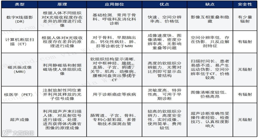 医学影像设备可分为大型医学影像设备和其他医学影像设备。大型影像诊断设备主要包括X线成像类(CR、DR、DSA等)、计算机断层扫描(CT)、磁共振成像(MRI)和核医学类(PET-CT、PET-MR等),其他影像设备主要包括超声成像设备和医用内镜。