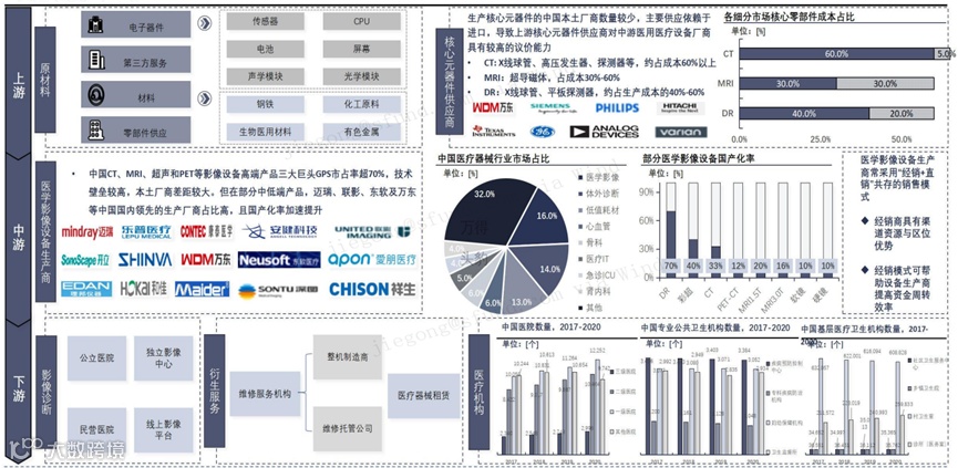 中国医学影像设备行业的上游市场参与者为核心元器件与非核心元器件供应商,中游环节主要为医学影像设备生产商与经销商,下游涉及各级医疗机构及衍生服务机构。产业链各环节的特点,可概述如下: