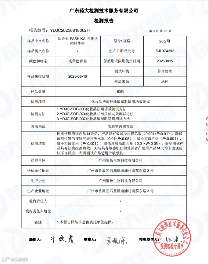 法诗卡祛痘精华霜在上市之前,公司团队投入了大量的时间、精力和资源,进行了深入的研究和开发工作,我们与皮肤科医生,医学领域专家和市场调研人员合作,共同研发了这款专业解决痘痘问题的产品,并且在产品上市之前,我们找到了几千人测试产品,在测试产品的同时,我们的产品也通过了祛痘行业权威机构的检测认证,拿到了祛痘特征证和敏感肌测试证件,除此之外,我们的产品有药监局备案,太平洋保险承保、奥运冠军代言,拥有多种专利成分和技术,在产品上市之前,我们的产品就通过了层层严苛的检验,在祛痘这个赛道里面做到了顶尖水平。