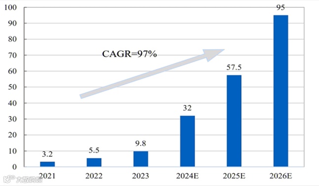根据工信部下属赛迪研究院数据,2021、2022、2023年我国eVTOL产业规模分别为3.2亿 元、5.5亿元、9.8亿元;同比增速分别为50%、75%、77%,预计2024年eVTOL产业将迎来新一轮商业化爆发周期,产业规模将达到32亿元,2026年将达到95亿元。2021-2026年复合增长率约为97%。