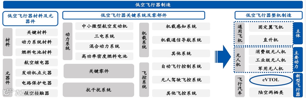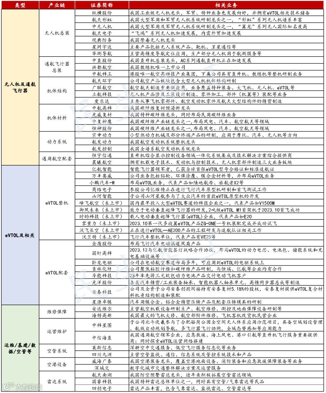 低空经济广泛存在三大产业中,从产业链环节来看,可以划分为低空飞行器制造、低空服务和低空运营维保三个环节。低空飞行器制造为低空经济发展提供初始动力;低空服务为低空经济发展提供各种基础设施及软硬件补充;低空运营维保基于前两个环节,开展具体业务,是低空经济的终端需求。现阶段为低空经济发展的初期,我们主要聚焦低空飞行器制造端。