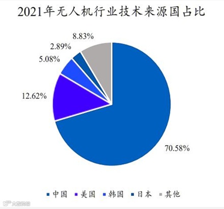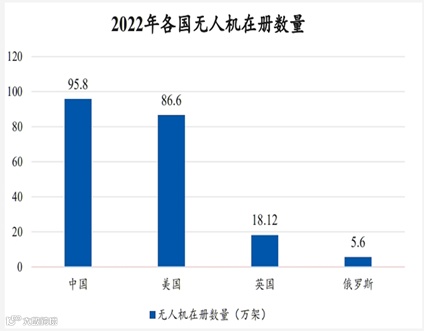 从无人机在册数量及技术来源看,我国在无人机领域位居全球第一。就无人机在册数量来看,2022年我国在册无人机为95.8万架,位居世界第一,而美国为86.6万架,居于第二,之后依次为英国18.12万架和俄罗斯5.6万架。就无人机技术来源国看,截至2021年,我国无人机专利申请量占全球70.58%,排名第二的美国仅占比12.62%。