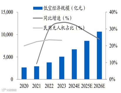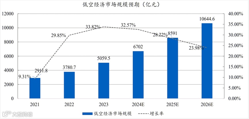 根据工信部下属赛迪研究院的最新数据,2023年中国低空经济规模已经达到5,059.5亿元,同比增速33.8%。预计2026年,中国低空经济市场规模将进一步扩大,突破万亿,2023-2026年复合增长率将达到30%。