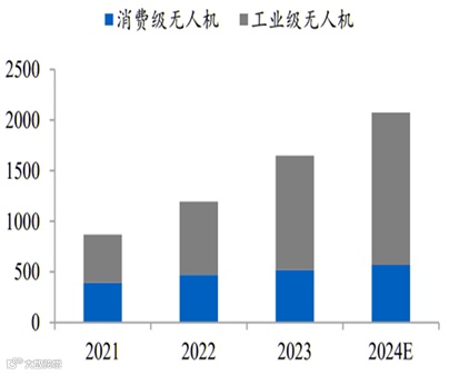 民用无人机是我国低空经济发展的重要组成部分。根据赛迪顾问测算,2023年中国民用无人机产业规模达1,174.3亿元,同比增长32.0%,占低空经济总规模约23.2%,在政策驱动下,有望继续保持20%以上的年化增长率。