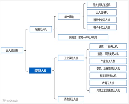 按用途划分,民用无人机可分为工业级无人机和消费级无人机。我国民用无人机发展初期,主要依赖消费级无人机驱动行业规模增长,近年,行业规模的主要驱动力变为工业无人机。2021年我国工业无人机规模首超消费级无人机,至2023年工业无人机占民用无人机产业总规模已提升到65.3%。