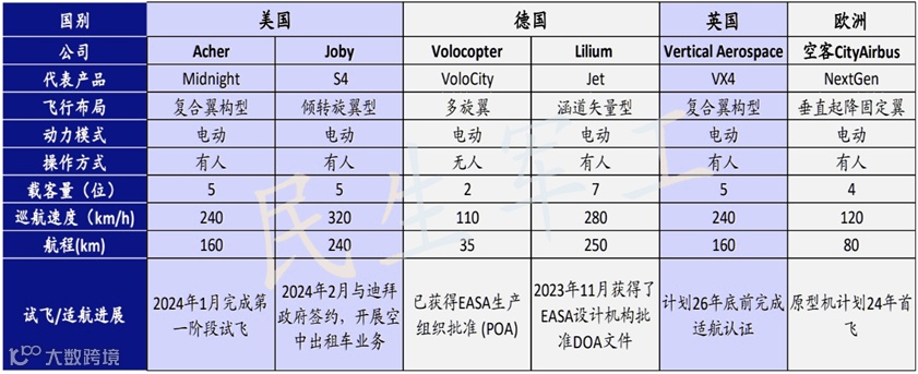 现阶段追踪eVTOL技术进展是关键。全球eVTOL制造商目前主要分布在美国、中国、德国和英国等,累计占据了80%以上的市场份额,追踪各国eVTOL代表企业的进展,产品性能指标接近,多数处于适航证(AC)认证阶段。