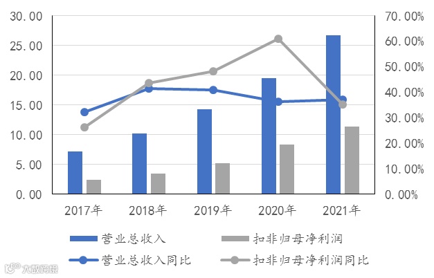 成长能力方面,健帆生物的总营收由2017年的7.18亿元增长至2021年的26.75亿元,复合增速达38.93%;扣非归母净利润由2017年的2.45亿元增长至2021年的11.37亿元,复合增速达46.77%。